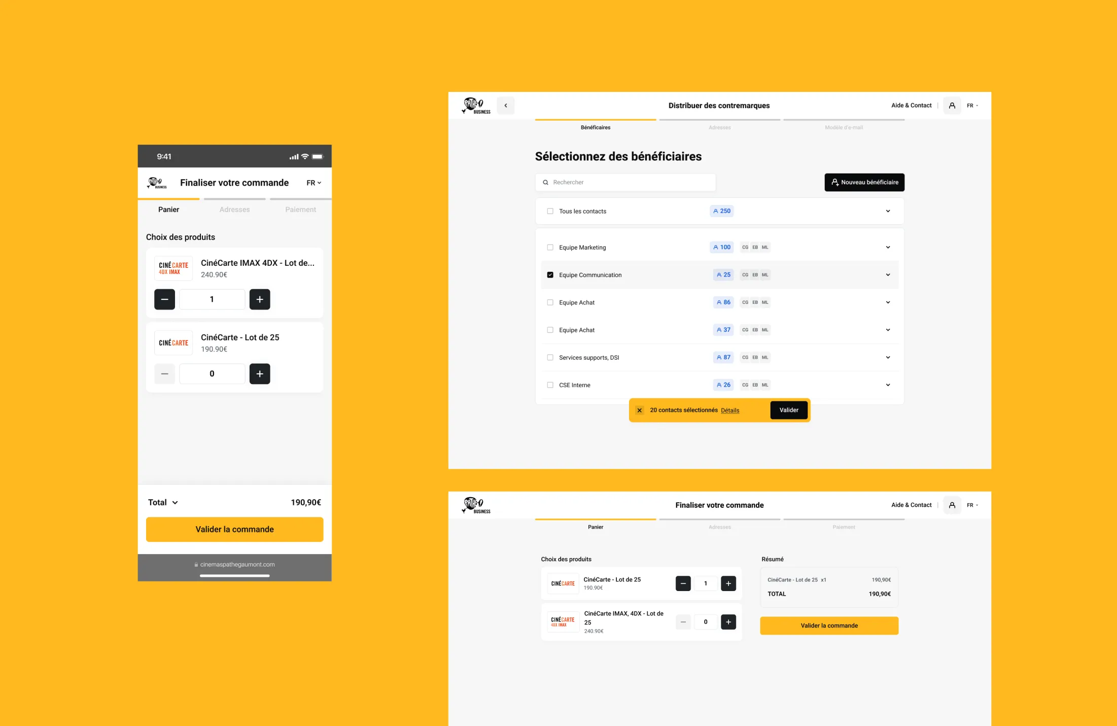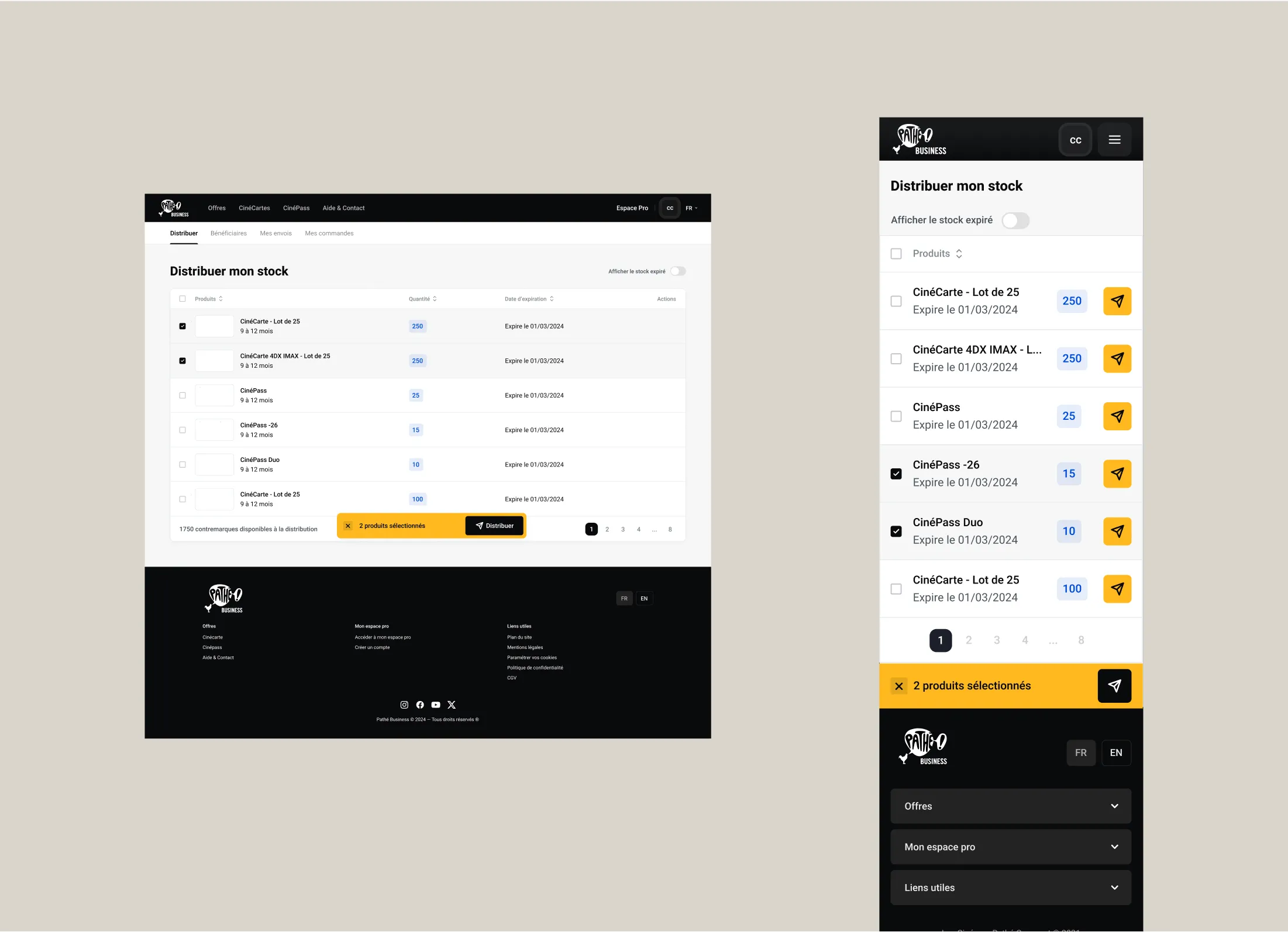The Pathé Business website offers services for corporate clients and associations, from bulk cinema ticket sales (like digital CinéCartes) to special event bookings. I worked on the redesign of the professional platform with the goal of simplifying and improving the purchasing and distribution experience. My role covered project scoping and prioritization, as well as the redesign of key features such as the customer space, registration process, and custom purchase and distribution flows.